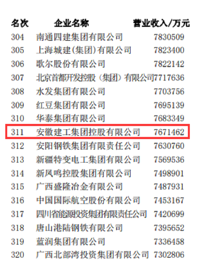 2022年9月6日,中國(guó)企業(yè)聯(lián)合會(huì)、中國(guó)企業(yè)家協(xié)會(huì)在京舉辦新聞發(fā)布會(huì),發(fā)布了“2022中國(guó)企業(yè)500強(qiáng)”榜單。安徽建工集團(tuán)以767.15億元的營(yíng)業(yè)收入位列榜單第311位,連續(xù)14年榮登中國(guó)企業(yè)500強(qiáng),較2021年的327位提升16位,保持總體平穩(wěn)、穩(wěn)中有進(jìn)的發(fā)展態(tài)勢(shì),品牌影響力和價(jià)值有效提升。